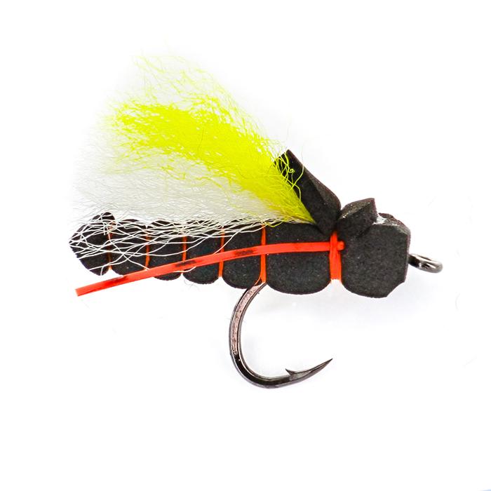 Imitation de Cigale . De par son corps fabriqué en foam , et ses ailes en poly yarn , cette artificielle a un excellente flottaison et visibilité .