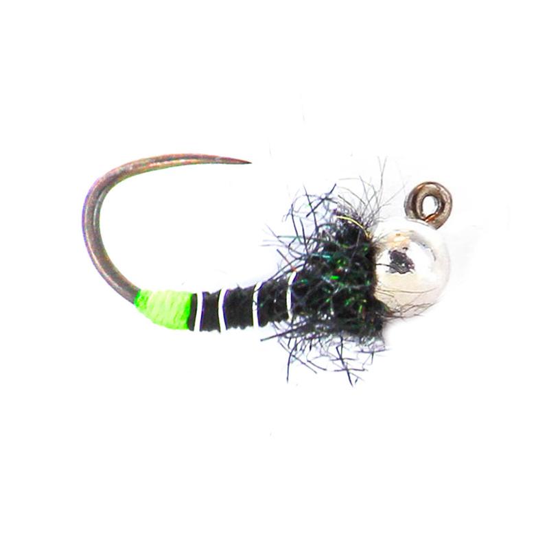Corps noir cerclé d'un tinsel argenté , thorax dubbing syntéthique noir . Un tag de couleur vert chartreux attire l'attention des poissons . Bille Tungstène argentée .