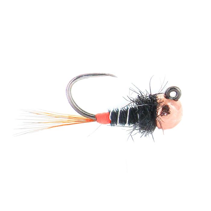 Corps en polyfloss noir cerclé d'un fil de cuivre , Thorax dubbing noir .Tag Rouge